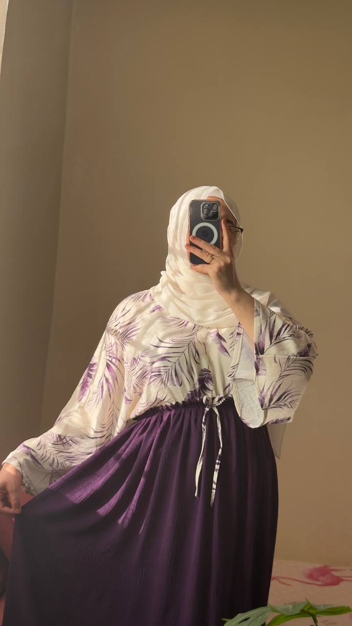 تصميم عملي بلمسة أنثوية، فيها توب خفيف بنقشة أوراق، وتنورة واسعة بتفصيل مطاطي في الخصر.